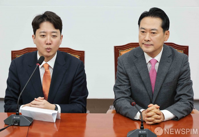 [서울=뉴스핌] 윤창빈 기자 = 이준석 개혁신당 대표가 13일 서울 여의도 국회에서 장동혁 국민의힘 대표와 회동을 하며 발언하고 있다. 2026.01.13 pangbin@newspim.com