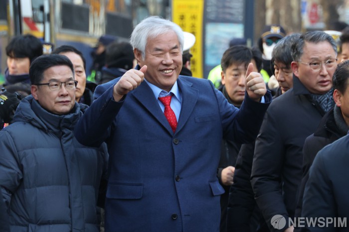 [서울=뉴스핌] 양윤모 기자 =특수공무집행방해 교사 등의 혐의로 구속영장이 청구된 전광훈 사랑제일교회 목사가 13일 오전 서울서부지법에서 개최된 구속 전 피의자 심문(영장실질심사)에 출석하고 있다. 전 목사는 윤석열 전 대통령 지지자들을 부추겨 지난해 1월 19일 윤 전 대통령이 구속된 직후 영장을 발부한 서울서부지법에 난입해 집기를 부수고 경찰을 폭행하게 한 혐의를 받는다. 2026.01.13 yym58@newspim.com