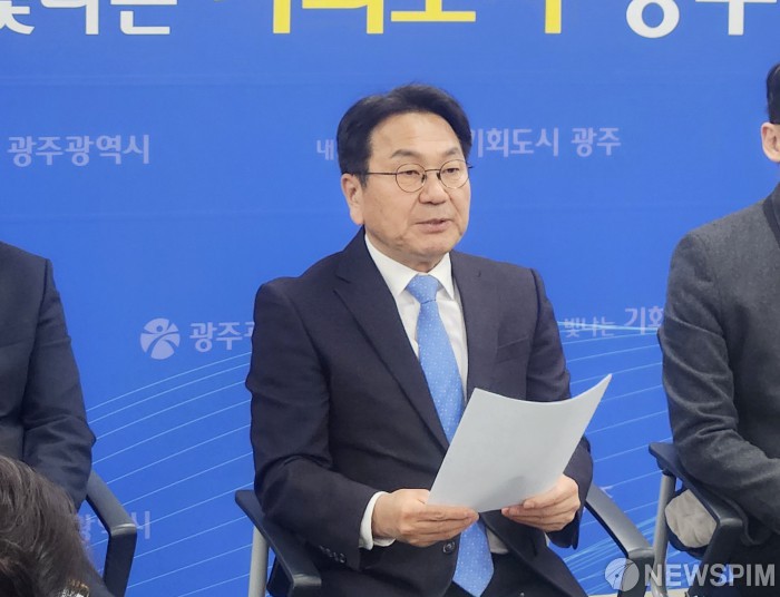 [광주=뉴스핌] 박진형 기자 = 강기정 광주시장이 청사 5층 기자실에서 차담회를 갖고 광주·전남 행정통합 관련해 설명하고 있다. 2026.01.13 bless4ya@newspim.com