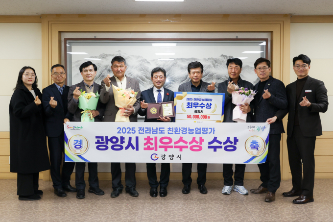 [광양수=뉴스핌] 권차열 기자 = 전남 광양시는 전라남도가 주관한 '2025년도 친환경농업대상' 평가에서 벼 외 품목 다양화와 저탄소 농업 확산에 탁월한 성과를 인정받아 최우수상을 수상했다고 13일 밝혔다.