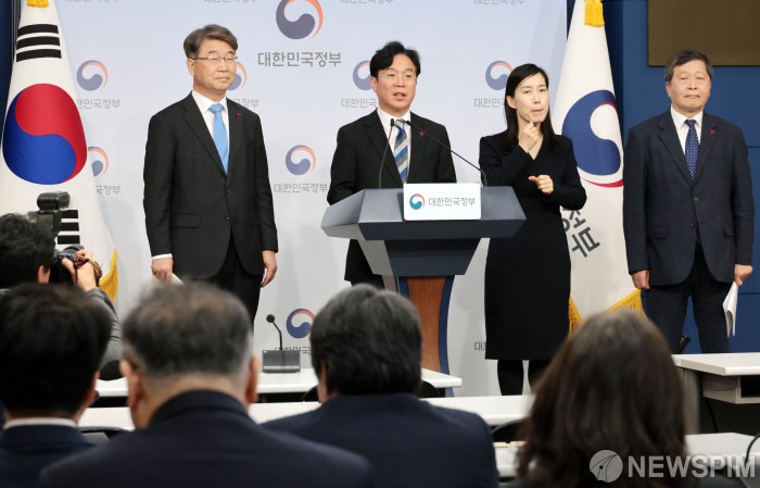 [서울=뉴스핌] 이길동 기자 = 김영훈 고용노동부 장관이 13일 서울 종로구 정부서울청사에서 고용노동부-경사노위-중노위 정책간담회 사후 브리핑을 하고 있다. 왼쪽부터 김지형 경사노위 위원장, 김 장관, 수어 통역사, 박수근 중노위 위원장 2026.01.13 gdlee@newspim.com