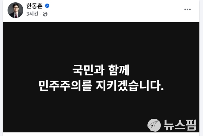 제명 처분 결정이 알려진 후 한동훈 전 대표는 자신의 페이스북에 근조(謹弔)를 상징하는 검은 바탕에 "국민과 함께 민주주의를 지키겠습니다"라는 짧은 글만을 남겼다.