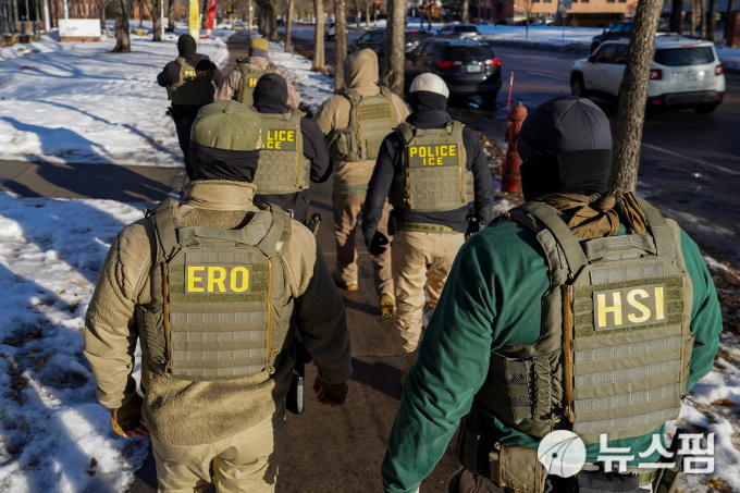 [미니애폴리스 로이터=뉴스핌] 최원진 기자= 미국 이민세관단속국(ICE) 요원들이 13일(현지시간) 미네소타주 미니애폴리스 길거리 순찰을 돌고 있다. 2026.01.14 wonjc6@newspim.com