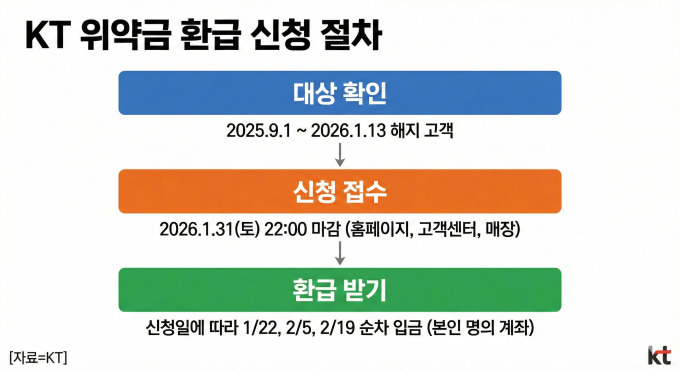 환급 신청은 이달 31일 오후 10시까지 진행된다. 신청은 KT 공식 홈페이지와 고객센터, 전국 KT 매장을 통해 가능하며, 원활한 처리를 위해 전담 콜센터도 운영된다.