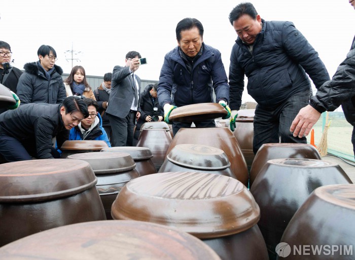 [당진=뉴스핌] 윤창빈 기자 = 정청래 더불어민주당 대표, 어기구 의원, 한민수 의원 등이 14일 충남 당진시 백석올미마을을 방문해 옹기 옮기기 작업을 하고 있다. 2026.01.14 pangbin@newspim.com