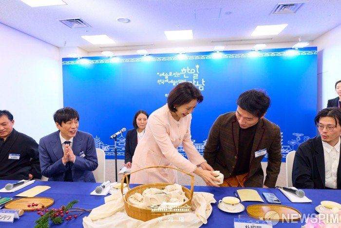 [서울=뉴스핌] 김혜경 여사가 지난 13일 일본 나라컨벤션센터에서 열린 재일 한국계 예술인 간담회에서 다과를 참석자들에게 나눠주고 있다. [사진=청와대] 2026.01.14 photo@newspim.com