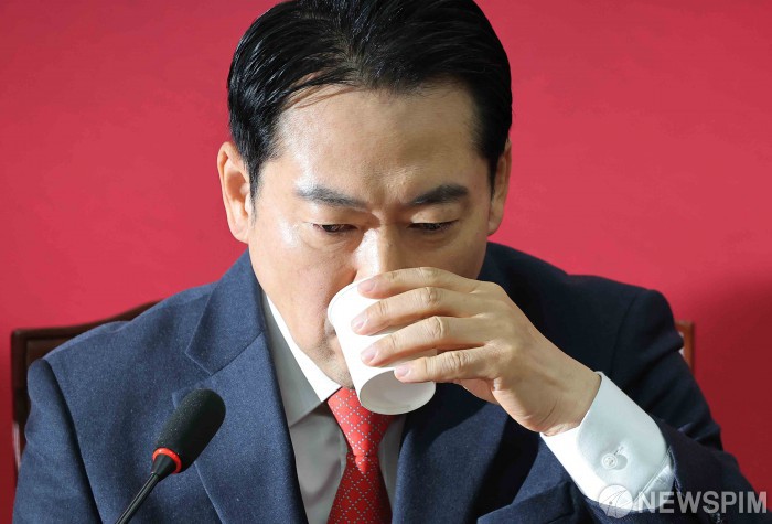 [서울=뉴스핌] 윤창빈 기자 = 장동혁 국민의힘 대표가 서울 여의도 국회에서 열린 최고위원회의에서 물을 마시고 있다. 2026.01.15 pangbin@newspim.com