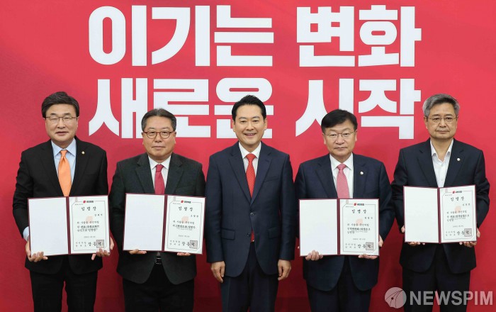 [서울=뉴스핌] 윤창빈 기자 = 장동혁 국민의힘 대표가 서울 여의도 국회에서 열린 최고위원회의에서 조광한 최고위원 등에게 임명장 수여를 마치고 기념촬영을 하고 있다. 왼쪽부터 김대식 당대표 특별보좌역 단장, 조 최고위원, 장 당대표, 정점식 정책위의장, 김장겸 당대표 정무실장. 2026.01.15 pangbin@newspim.com
