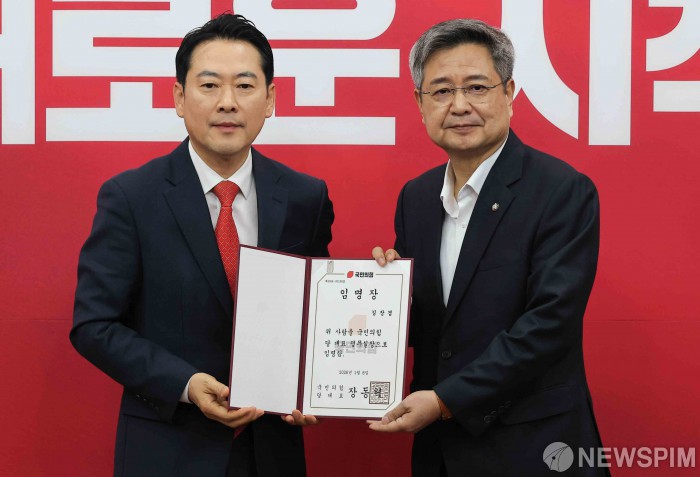 [서울=뉴스핌] 윤창빈 기자 = 장동혁 국민의힘 대표가 서울 여의도 국회에서 열린 최고위원회의에서 김장겸 당대표 정무실장에게 임명장 수여를 마치고 기념촬영을 하고 있다. 2026.01.15 pangbin@newspim.com