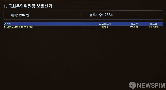 [서울=뉴스핌] 윤창빈 기자 = 15일 서울 여의도 국회 본회의에서 열린 국회운영위원장 보궐선거에서 한병도 더불어민주당의원이 득표율 91.60%로 당선이 확정되고 있다. 2026.01.15 pangbin@newspim.com