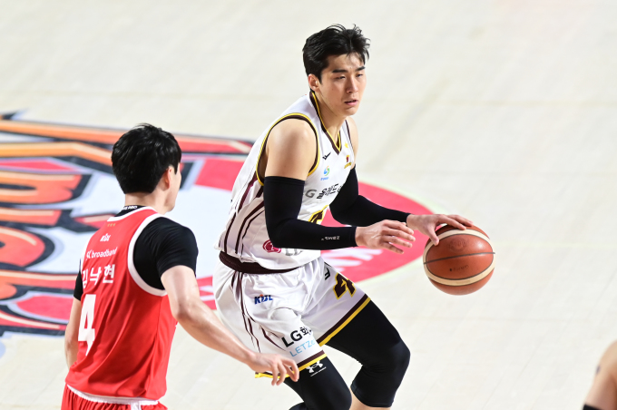 [잠실학생=뉴스핌]이웅희 기자=LG 양홍석이 15일 SK와의 원정경기에서 드리블을 하며 공격 기회를 살피고 있다. [사진=KBL] 2026.01.15 iaspire@newspim.com