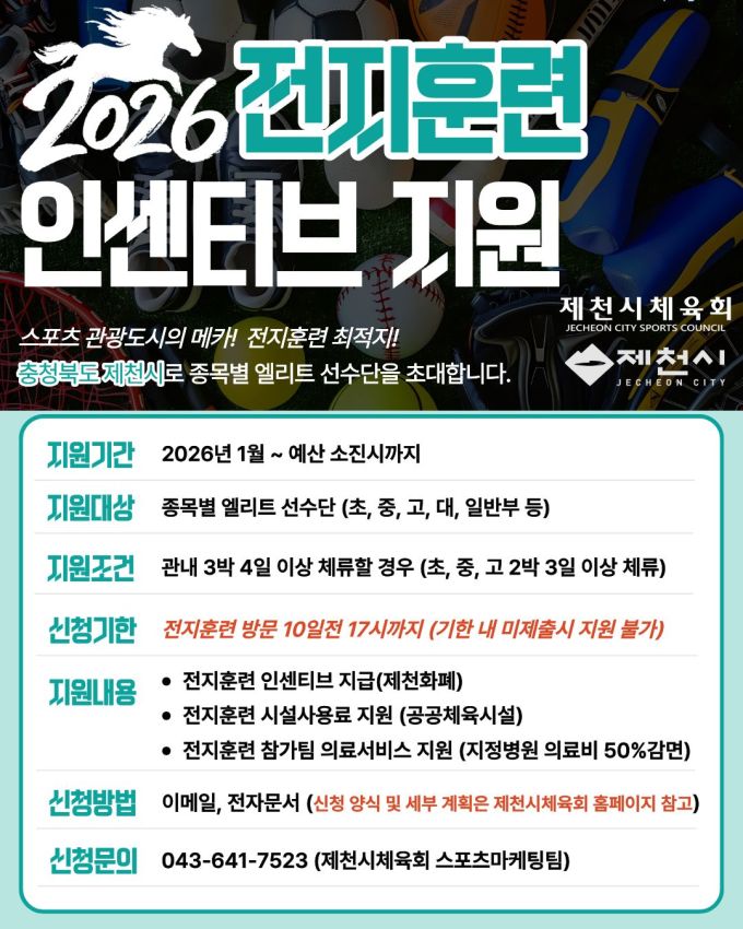 [제천=뉴스핌] 조영석 기자 =충북 제천시체육회는 매년 각 종목별 엘리트 선수단 전지훈련 팀을 대상으로 운영해 온 전지훈련 인센티브 지원을 2026년 전지훈련 시즌에도 지속 추진한다고 16일 밝혔다.