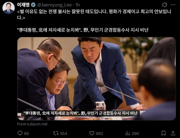 이 대통령은 '"李대통령, 北에 저자세로 눈치봐".. 野, 무인기 군경합동수사 지시 비난'이라는 제목의 기사를 함께 게시했다.