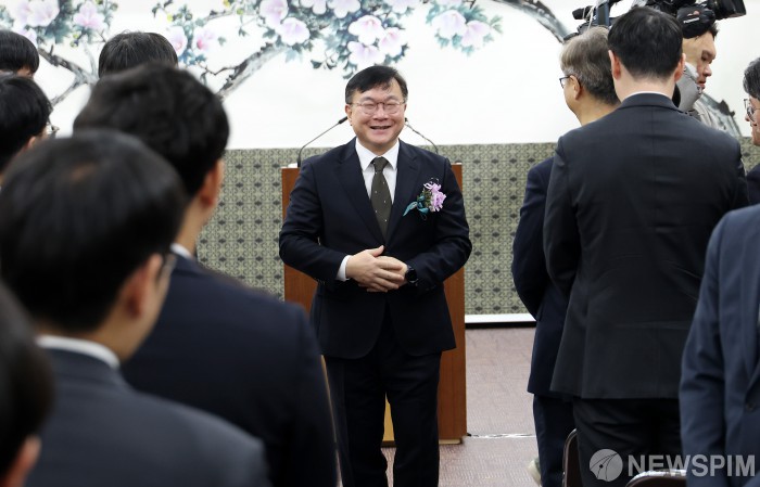 [서울=뉴스핌] 정일구 기자 = 박영재 신임 법원행정처장이 16일 오전 서울 서초구 대법원에서 열린 취임식을 마친 뒤 직원들에게 인사하고 있다. 2026.01.16 mironj19@newspim.com