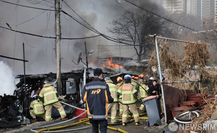 [서울=뉴스핌] 양윤모 기자 = 16일 오전 5시경 서울 강남구 개포동 구룡마을 4구역에서 화재가 발생해 소방관들이 진화를 하고 있다. 소방당국은 대응 1단계를 2단계로 격상하고 추가 인력을 투입 진화를 완료했다. 2026.01.16 yym58@newspim.com