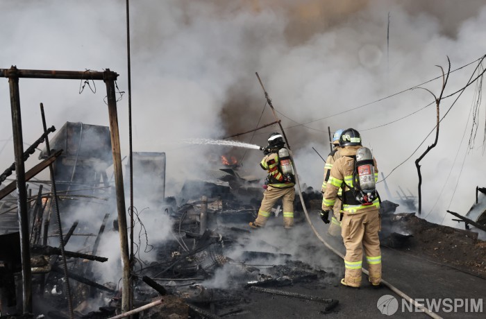[서울=뉴스핌] 양윤모 기자 = 16일 오전 5시경 서울 강남구 개포동 구룡마을 4구역에서 화재가 발생해 소방관들이 진화를 하고 있다. 소방당국은 대응 1단계를 2단계로 격상하고 추가 인력을 투입 진화를 완료했다. 2026.01.16 yym58@newspim.com