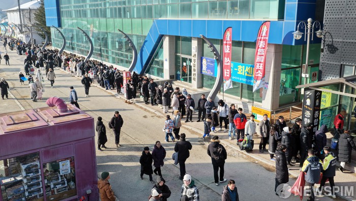 [서울=뉴스핌] 18일 주말을 맞아 강원도 평창군 진부면 오대천 일원에 열린 평창송어축제를 찾은 방문객들이 입장권을 구입하기 위해 줄지어 서있다. ‘겨울이 더 즐거운 송어 나라, 평창’이라는 주제로 열린 올해 축제는 내달 9일 까지 방문객을 맞는다. [사진=평창군청] 2026.01.18 photo@newspim.com