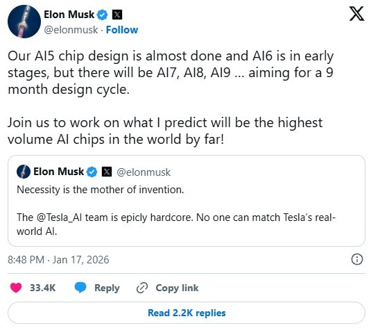 [서울=뉴스핌] 이홍규 기자 = 머스크 최고경영자는 X 플랫폼 게시물을 통해 테슬라(TSLA)가 AI5 칩 설계를 거의 마무리했으며, 차세대 AI6 칩 개발 초기 단계에 진입했다고 밝혔다. 그는 향후 칩 설계 반복 주기를 9개월로 목표하고 있다고 덧붙였다.