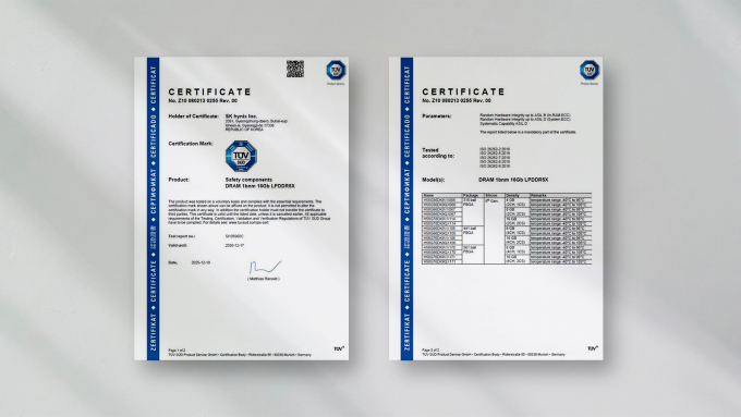 19일 SK하이닉스 뉴스룸에 따르면, 최근 최신 LPDDR5X 차량용 D램 제품으로 ISO 26262의 최고 등급인 ASIL-D 인증을 완료했다. ASIL-D는 글로벌 인증기관인 TÜV SÜD가 설계, 검증, 품질 관리 등 제품 개발 전 과정을 종합 평가해 부여하는 기능 안전 최고 등급이다. 자율주행 제어 시스템처럼 고도의 안전성이 요구되는 핵심 분야는 반드시 이 등급을 충족해야 한다.