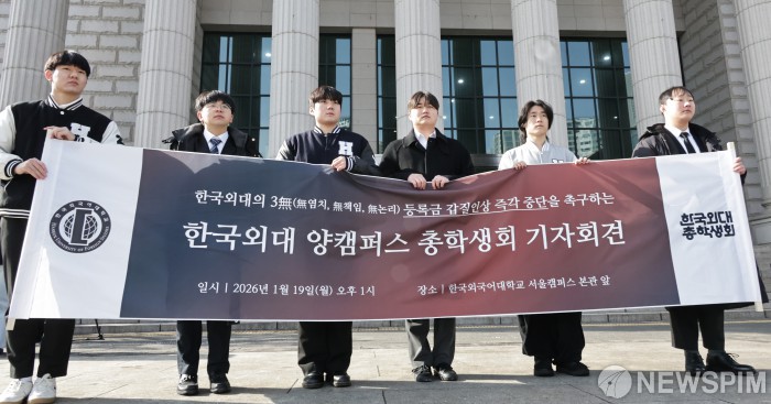 [서울=뉴스핌] 양윤모 기자 = 한국외국어대학교 총학생회 학생들이 19일 오후 서울 동대문구 이문동 한국외국어대학교 서울캠퍼스 본관 앞에서 학교 측이 제시한 3.19%의 등록금 인상안에 항의 기자회견을 하고 있다. 2026.01.19 yym58@newspim.com
