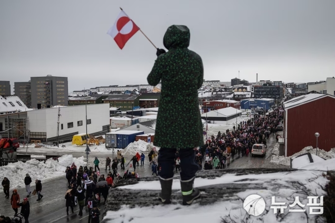 [누크 로이터=뉴스핌] 장일현 특파원 = 지난 17일(현지 시간) 그린란드 수도 누크에서 열린 '미국 반대' 집회에서 한 그린란드 여성 주민이 그린란드 기(旗)를 흔들고 있다. 그린란드 주민 대다수는 미국의 그린란드 병합 시도를 강력하게 반대하고 있다. 2026.01.19. hjang67@newspim.com