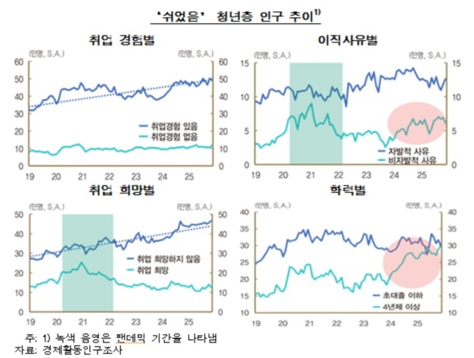 학력별로는 초대졸 이하 청년층 비중이 여전히 높은 가운데, 최근 들어 4년제 대학 이상 학력의 '쉬었음' 청년도 빠르게 증가하고 있는 것으로 나타났다. 한국은행은 인공지능(AI) 기반 기술 변화와 기업의 경력직 선호 등 구조적 요인이 청년층 노동시장 진입을 어렵게 만들고 있다고 분석했다.