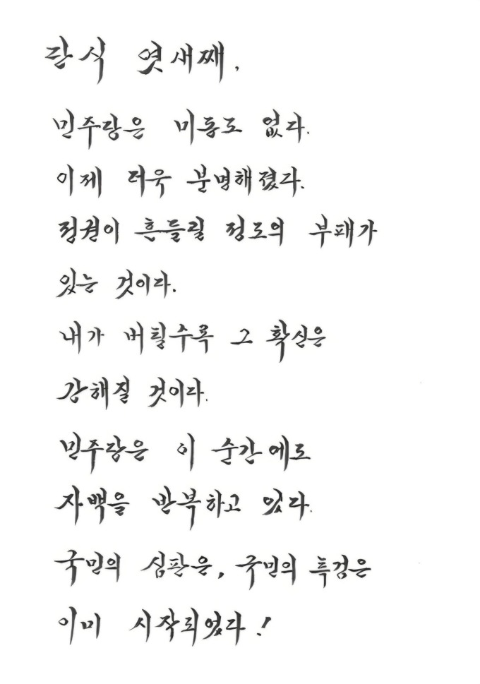 장 대표는 이날 국회 로텐더홀 단식 현장에서 기자들과 만나 "재판을 해보면 피고인이 똑같은 질문에 답하지 않을 경우 판사들은 사실상 자백으로 인정한다"며 "목숨을 걸고 극단적인 방법까지 동원해 하루하루 민주당에 답을 요구하고 있는데, 민주당이 답하지 않으면 국민께서는 그 자체를 자백으로 생각하실 것"이라고 밝혔다.