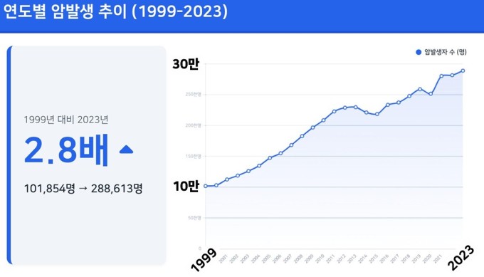 한국의 암 환자 발생 수는 증가 추세다. 2023년 신규 발생한 암 환자 수는 28만8613명으로 남자 15만1126명, 여자 13만7487명이다. 전년 대비 7296명 늘었다. 암 통계가 처음으로 집계된 1999년(10만1854명) 대비 2.8배 증가했다. 성별에 따르면, 우리나라 국민이 평생 동안 암이 발생할 확률이 남자는 44.6%로 약 2명 중 1명이다. 여자는 38.2%로 3명 중 1명으로 추정된다.