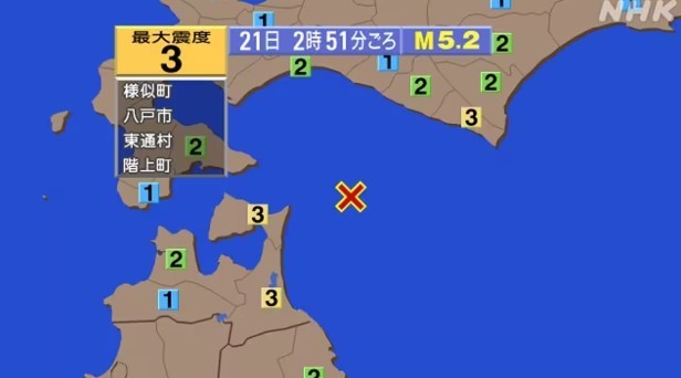 [서울=뉴스핌] 오영상 기자 = 21일 오전 2시 51분경, 일본 홋카이도와 아오모리현 일대에서 규모 5.2, 최대 진도 3의 지진이 발생했다.