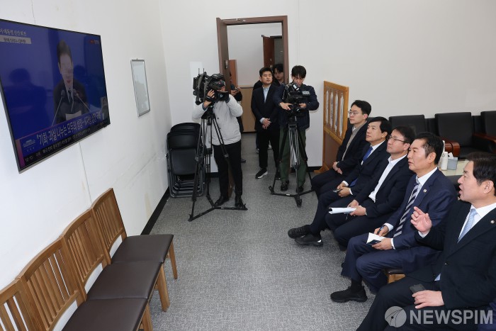 [서울=뉴스핌] 정일구 기자 = 정청래 더불어민주당 대표와 한병도 원내대표를 비롯한 지도부가 21일 오전 서울 여의도 국회에서 이재명 대통령 신년 기자회견 생중계를 시청하고 있다. 2026.01.21 mironj19@newspim.com