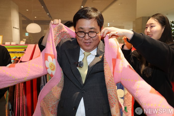 [서울=뉴스핌] 이형석 기자 = 최휘영 문화체육관광부 장관이 22일 오후 서울 여의도 더현대 서울을 찾아 2026 코리아그랜드세일에 참여하는 매장 '위글위글'에서 판매 제품을 착요하고 있다. 2026.01.22 leehs@newspim.com