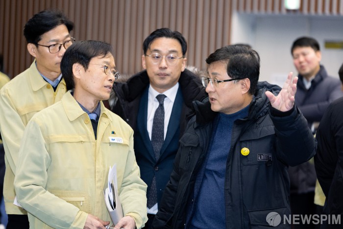 [서울=뉴스핌] 김성환 기후에너지환경부장관이 22일 전남 나주시 소재 전력거래소를 방문하여 동계 전력수급 상황을 점검하고 있다.[사진= 기후에너지환경부] 2026.01.22 photo@newspim.com