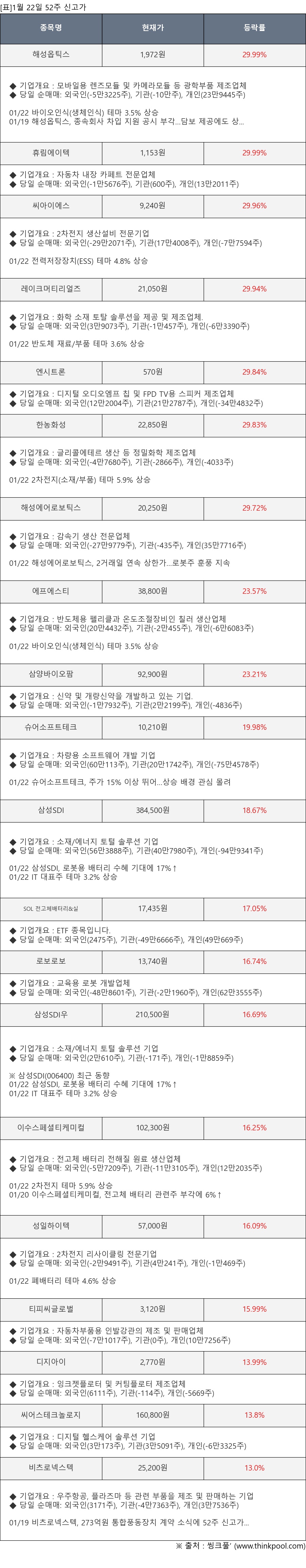 [표]1월 22일 52주 신고가 종목 및 최근 동향