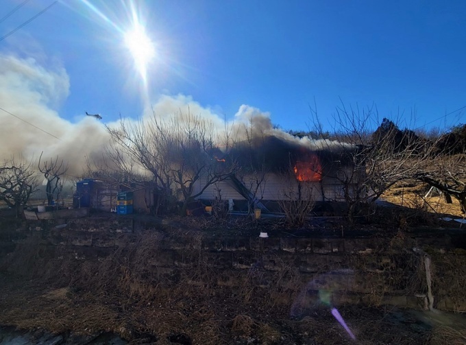 [영천=뉴스핌] 남효선 기자 = 22일 낮 12시 22분쯤 경북 영천시 청통면의 한 단독주택에서 화재가 발생해 인근 야산으로 확산된 가운데 진화당국이 발화 50분 만에 큰 불길을 잡고 완전 진화에 주력하고 있다.