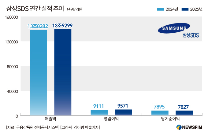 22일 삼성SDS는 2025년 연간 실적으로 매출 13조9299억원, 영업이익 9571억원을 기록했다고 밝혔다. 전년 대비 매출은 0.7%, 영업이익은 5.0% 각각 증가했다. 반면, 지난해 4분기 매출은 3조5368억원으로 2.9% 감소했지만, 영업이익은 2261억원으로 6.9% 늘었다.