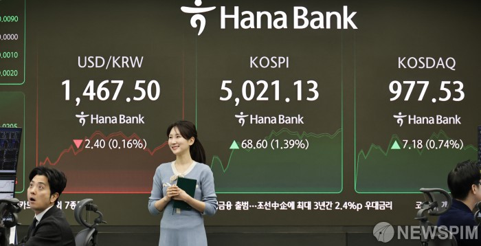 [서울=뉴스핌] 양윤모 기자 = 23일 오전 코스피가 전장 종가보다 68.60 포인트(1.39%) 상승하며 5021.41으로, 코스닥은 7.18포인트(0.74%) 상승한 977.53으로 장을 시작한 가운데, 서울 중구 하나은행본점 딜링룸에서 직원들이 업무를 보고 있다. 서울외환시장에서 달러/원 환율은 전장 대비 2.40원 하락한 1467.60원에 주간거래를 시작했다. 2026.01.23 yym58@newspim.com