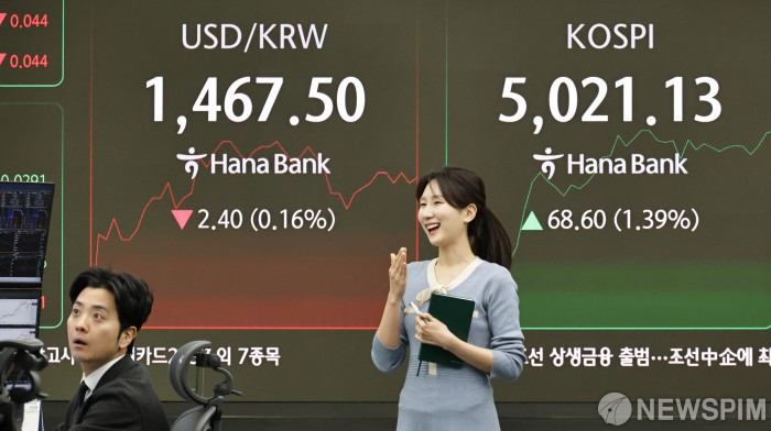 [서울=뉴스핌] 양윤모 기자 = 23일 오전 코스피가 전장 종가보다 68.60 포인트(1.39%) 상승하며 5021.41으로, 코스닥은 7.18포인트(0.74%) 상승한 977.53으로 장을 시작한 가운데, 서울 중구 하나은행본점 딜링룸에서 직원들이 업무를 보고 있다. 서울외환시장에서 달러/원 환율은 전장 대비 2.40원 하락한 1467.60원에 주간거래를 시작했다. 2026.01.23 yym58@newspim.com