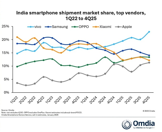 지난 20일 시장조사업체 옴디아에 따르면 비보는 중저가 스마트폰이 대세인 인도 시장에서 지난 2024년부터 삼성전자를 제치고 점유율 1위를 기록하고 있다. 격차도 점차 벌어져 지난해 4분기 비보의 점유율은 21%까지 올랐다. 삼성전자(15%)는 오포와 샤오미(각 13%), 애플(10%)과 함께 2위권 경쟁을 벌이고 있다.