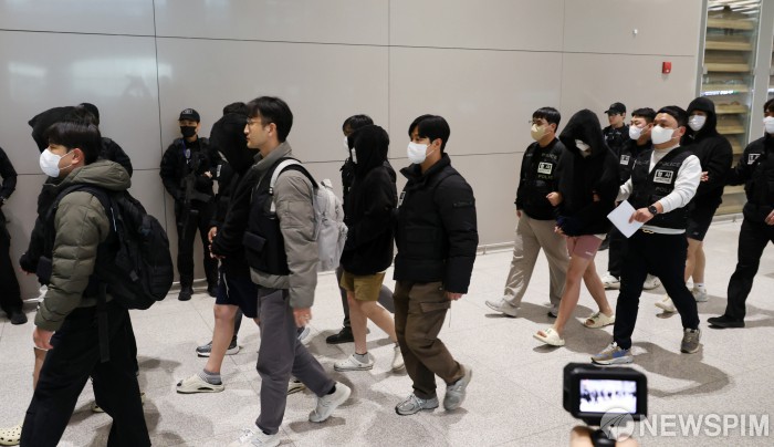 [영종도=뉴스핌] 정일구 기자 = 딥페이크 기술을 이용해 120억원을 가로챈 '로맨스 스캠 부부사기단' 등 캄보디아에서 각종 범행을 저지른 한국인 범죄 피의자 73명이 23일 오전 인천국제공항 제2여객터미널을 통해 송환되고 있다. 2026.01.23 mironj19@newspim.com