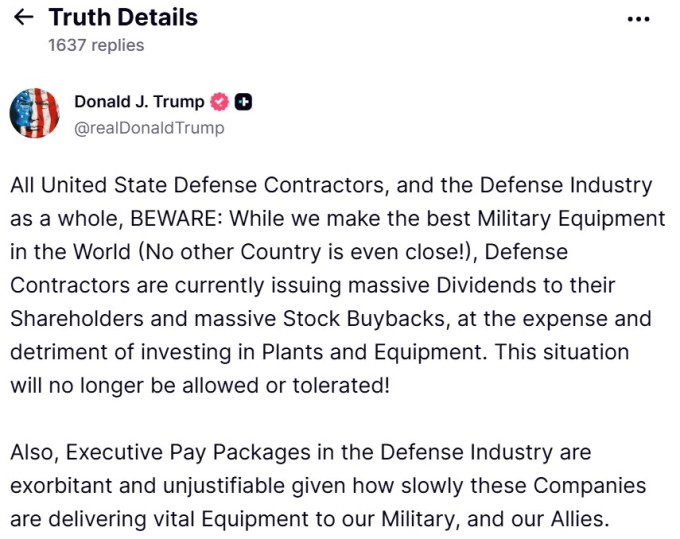 트럼프 대통령은 1월 7일 소셜 미디어 게시물을 통해 현재의 군수품 생산 속도를 비난하며, 특히 주요 프로그램들이 수년간의 적체에 직면해 있는 동안 수십억 달러가 주주 수익에 할당되는 것을 겨냥했다. 그는 엄격한 생산 및 유지보수 기준을 충족하지 못하는 모든 방위산업체의 배당금 지급과 자사주 매입을 금지하겠다고 위협했다.