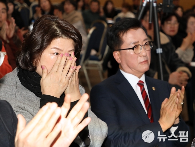 [대전=뉴스핌] 김수진 기자 = 24일 오후 유성 DCC제1전시장에서 열린 '조원휘의 오직 유성' 출판기념회 겸 북콘서트에서 조원휘 대전시의장의 부친 조방욱 씨의 축하 영상이 상영되는 가운데, 부인과 조 의장이 눈물을 흘리고 있다. 2026.01.24 nn0416@newspim.com