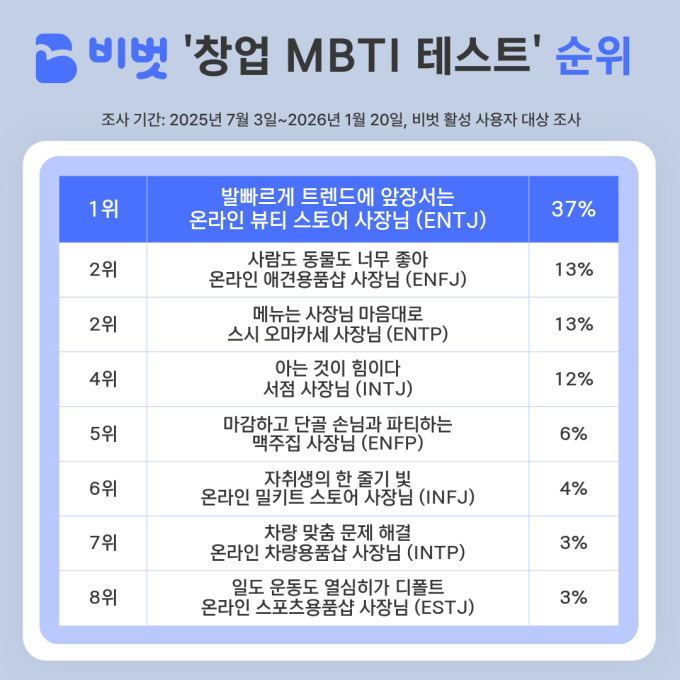 이번 조사는 지난해 7월 3일부터 올해 1월 20일까지 비벗 앱에서 '창업 MBTI 테스트'에 참여한 이용자들의 데이터를 바탕으로 이뤄졌다.