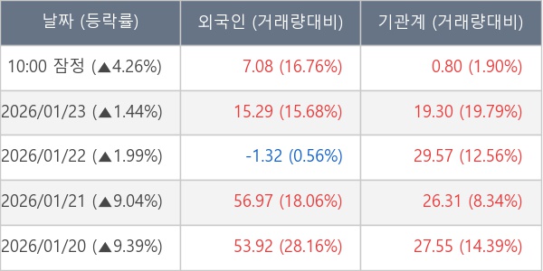[서울=뉴스핌] 로보뉴스 = 26일 10시 15분 현재 실리콘투(257720)는 전일 대비 4.26% (현재가 51,400원) 상승했고, 기관이 최근 5일 연속 순매수(누적 103.54만 주, 잠정) 행진을 하고 있다.