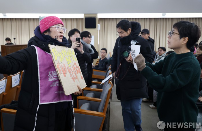 [서울=뉴스핌] 정일구 기자 = 복직 투쟁 중인 중학교 교사 지혜복 씨가 26일 오전 서울 중구 시청 서소문청사에서 열린 제11회 학생인권의 날 기념식에서 행사 참석자와 언쟁을 벌이고 있다. 2026.01.26 mironj19@newspim.com
