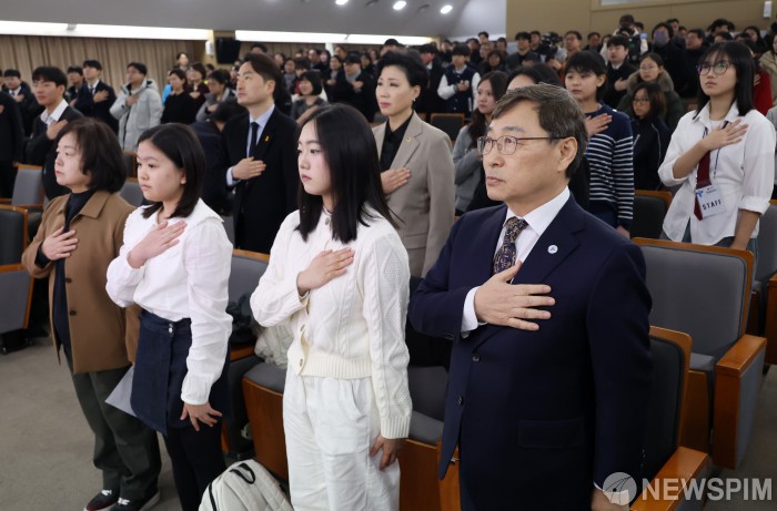 [서울=뉴스핌] 정일구 기자 = 정근식 서울시교육감이 26일 오전 서울 중구 서울시청 서소문별관 후생동에서 열린 제11회 서울특별시 학생인권의 날 기념식에서 참석자들과 국민의례를 하고 있다. 2026.01.26 mironj19@newspim.com