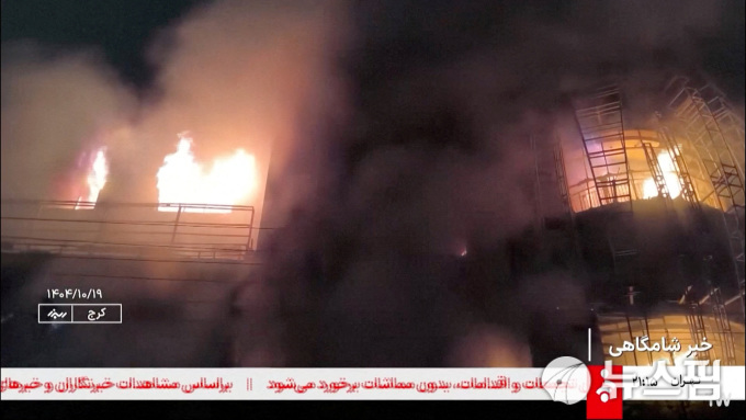 이란 국영 방송의 방송 화면을 캡처한 이 사진은 2026년 1월 10일, 극심한 경제난으로 촉발된 소요 사태 직후 이란 카라지(Karaj)에서 한 건물이 화염에 휩싸여 있는 모습을 보여주고 있다. [사진=로이터 뉴스핌]