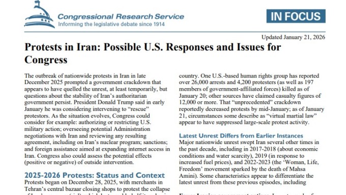 CRS는 지난 21일(현지시간) 작성된 '이란의 시위: 미국의 가능한 대응 및 의회 이슈(IF13153)' 제목의 최신 보고서에서 경제 붕괴와 연이은 군사적 패배로 이란 정권이 '전례 없는 약점'을 드러냈다고 진단했다. 이란 당국의 전례 없는 탄압 속에 1월 중순 현재 이란이 준계엄에 가까운 통제 상황 속에서 대규모 시위 활동은 억제된 것으로 보인다면서도 이번 소요가 과거 물 부족(2017-2018), 연료 가격(2019), 히잡 의무화(2022-2023) 등 특정 사안에 한정됐던 시위와 달리, 체제 자체를 겨냥한 구조적 도전에 가깝다고 평가했다. 이란 당국이 과거 폭력 진압과 제한적 정책 완화를 병행하며 반발을 누그러뜨렸지만, 이번에는 심각한 경제 기능 마비와 '하메네이 퇴진·체제 종식' 요구가 맞물려 쓸 수 있는 정책적 당근이 거의 남지 않은 상황이라는 분석이다.