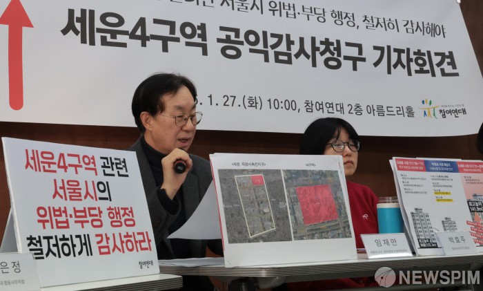 [서울=뉴스핌] 김학선 기자 = 참여연대 관계자들이 27일 서울 종로구 참여연대 아름드리홀에서 세운4구역 관련 서울시 공익감사청구 기자회견을 하고 있다. 2026.01.27 gdlee@newspim.com