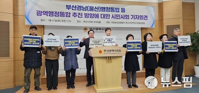 [부산=뉴스핌] 남동현 기자 = 지방분권균형발전부산시민연대와 분권균형이 27일 오전 11시 부산시의회 3층 브리핑룸에서 기자회견을 열고 부산·경남(울산) 행정통합을 비롯한 분권형 광역행정통합 추진 방향을 제안하고 있다.2026.01.27 ndh4000@newspim.com