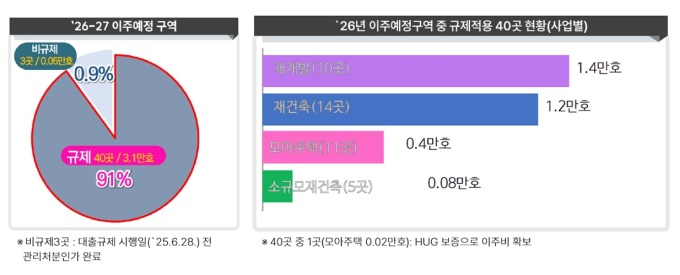 이번 조사 대상 43곳 중 대출규제를 적용받지 않는 3곳(시행일 전 관리처분인가 완료)과 주택도시보증공사(HUG) 이주비 융자를 승인받은 모아주택 1곳을 제외한 39곳이 규제 영향권에 놓였다. 이 중 재개발·재건축이 24곳(2.62만가구), 모아주택 등 소규모주택정비사업이 15곳(0.44만가구)이다.
